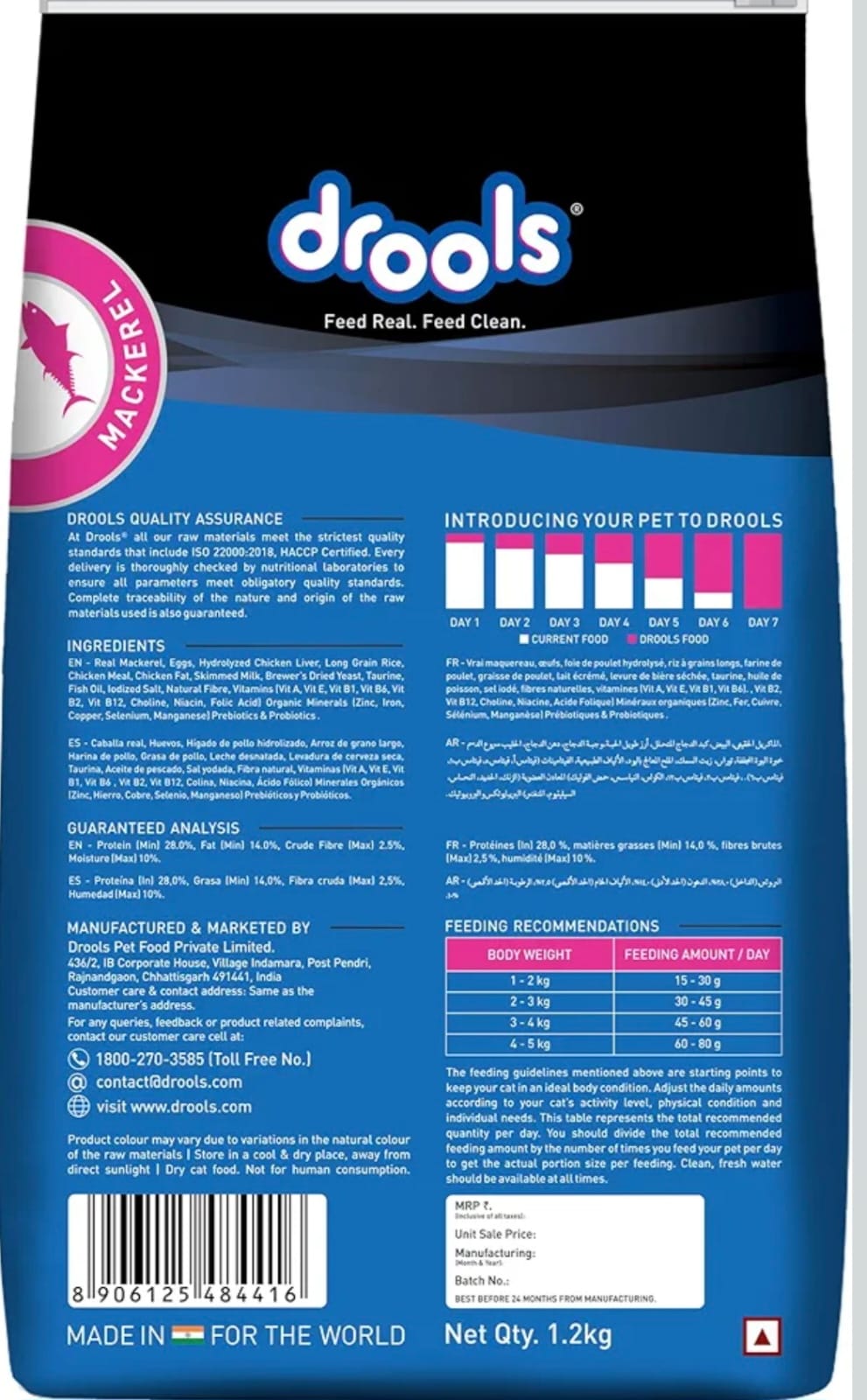 Drools Mackerel Adult Cat Dry Food is formulated to meet the complete nutritional requirements of adult cats. Enriched with mackerel, a rich source of omega-3 fatty acids, this premium dry food supports healthy skin and a lustrous coat. The balanced blend of proteins and essential nutrients promotes optimal digestion and maintains lean muscle mass. Designed for cats aged one year and above, it delivers sustained energy throughout the day while supporting immune function. Each bite combines palatability with nutritional excellence, ensuring your feline companion receives wholesome nourishment in every meal.