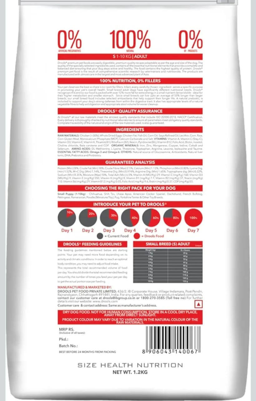 Drools Premium Small Breed Adult Dog Dry Food is formulated specifically for small breed dogs, delivering complete nutrition tailored to their unique metabolic needs. This premium blend combines high-quality proteins and essential amino acids to support lean muscle development and maintain optimal body condition. Enriched with omega fatty acids, it promotes a healthy coat and skin, while a balanced mineral profile strengthens bones and teeth. The carefully selected ingredients aid digestive health, ensuring better nutrient absorption and consistent energy levels throughout the day. Ideal for adult small breed dogs requiring specialized nutrition for sustained vitality and wellness.
